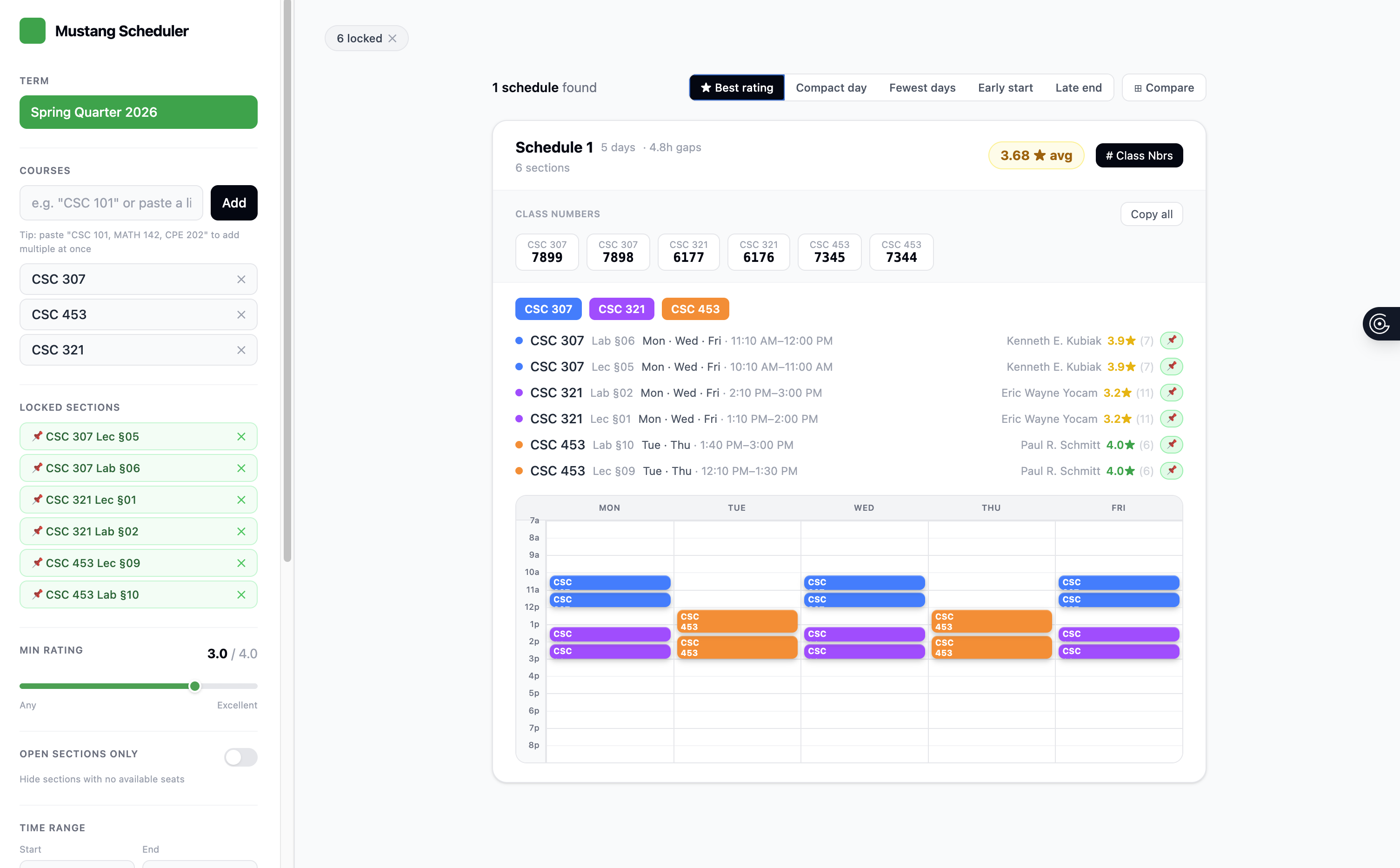 Full-stack course scheduling tool actively used by Cal Poly students. Built a Scrapy web scraper to pull live course data, professor ratings, and seat availability into PostgreSQL. Implements conflict-free schedule generation with time constraint and preference filters.